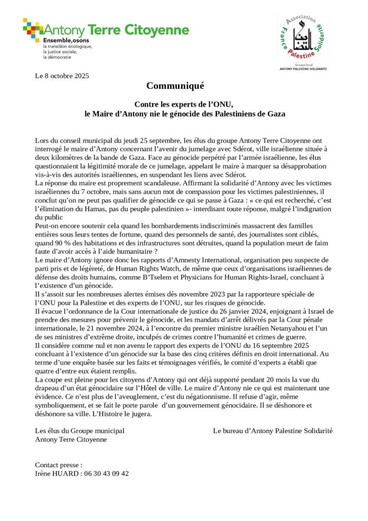 - Octobre 2025 : Contre les experts de l’ONU, le Maire d’Antony nie le génocide des Palestiniens de Gaza–